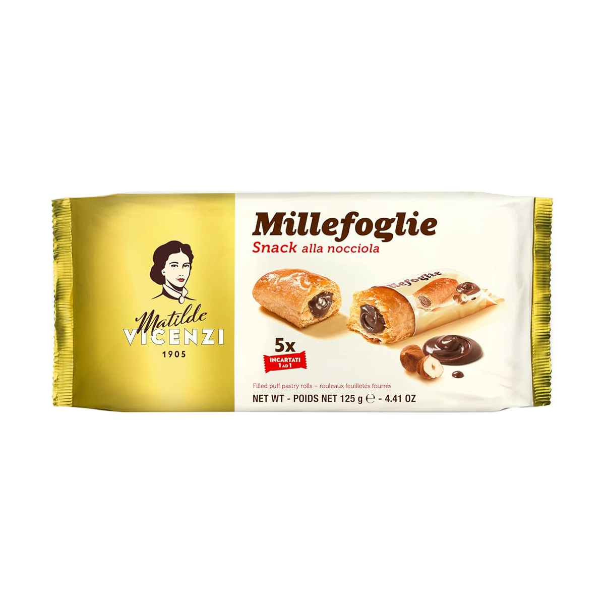 O Biscoito Folhado Recheado com Creme de Avelã da Vicenzi possui uma crocância e sabor delicados, com cada mordida irradiando a harmonia de sabores que somente as grandes obras-primas da tradição italiana de confeitaria podem oferecer. A seleção cuidadosa de matérias-primas, prestando especial atenção às práticas tradicionais, é perceptível desde o primeiro vislumbre. Para fazer as camadas finas que formam a fragrância da massa, o ingrediente essencial usado por Matilde Vicenzi é um véu de manteiga aplicado entre as dobras da massa. A receita tradicional exige que a massa seja dobrada suavemente sobre si mesma muitas vezes, obtendo-se uma massa deliciosa e perfumada, composta de bem 192 camadas. O uso de manteiga caseira nesta receita permite alcançar altos níveis de qualidade.