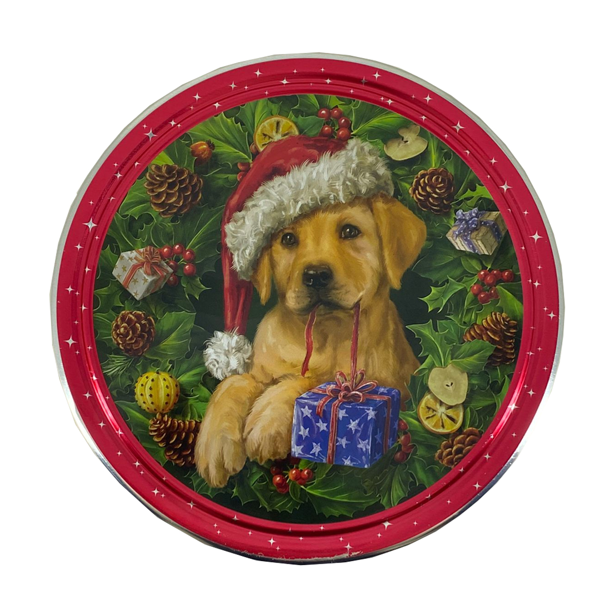 Lata metálica decorativa com diferentes estampas natalinas colecionáveis.