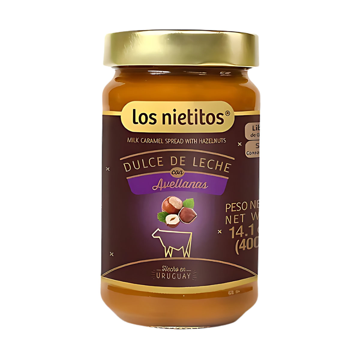 O doce de leite uruguaio com avelãs Los Nietitos é elaborado com a receita tradicional uruguaia de sabor doce natural e artesanal característico, elaborado 100% com leite fresco e açúcar, sem conservantes e sem glúten, textura lisa e cremosa, cor caramelo e brilho intenso. Especial para saborear a qualquer hora do dia, principalmente, com uma pitada de avelã natural, acrescentando um gostinho delicioso.