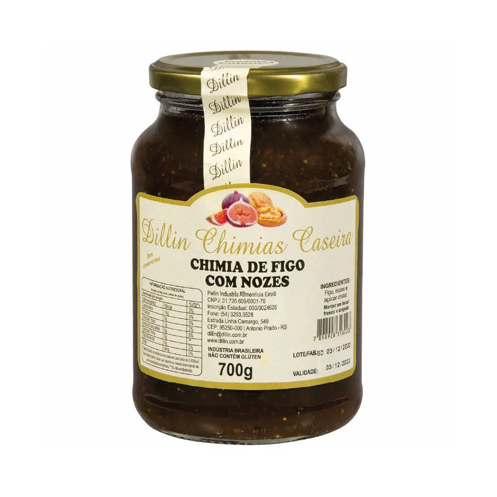 Chimia de Figo com Nozes Dillin em embalagem com 700 gramas. Feita com ingredientes naturais e açúcar cristal. Feita no interior gaúcho, a porção com 20 gramas possui 59 calorias e 10 gramas de carboidratos.