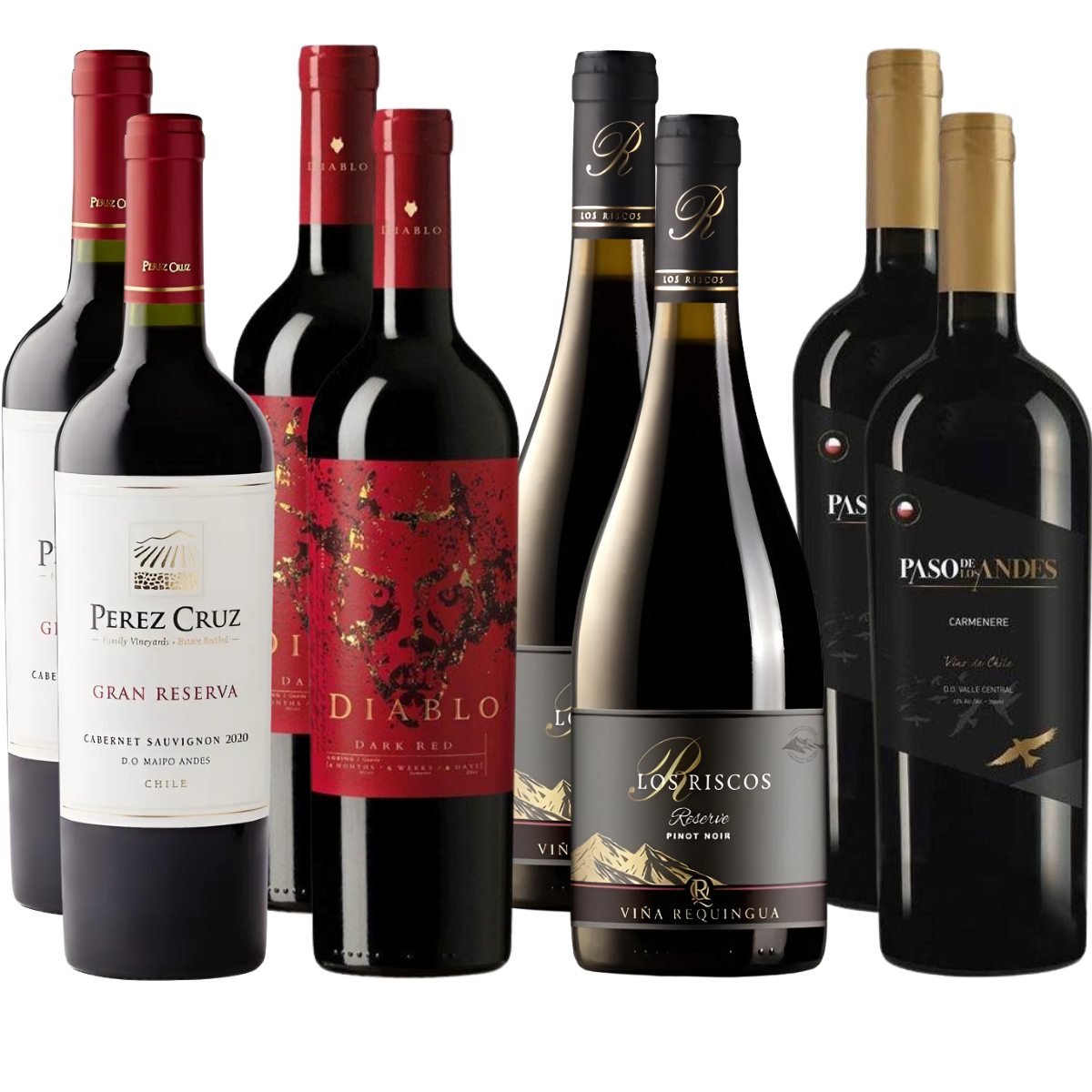 Uma seleção que expressa a diversidade e a força do Chile: a elegância estruturada do Perez Cruz Gran Reserva, o perfil intenso e envolvente do Diablo Dark Red, a leveza refinada do Los Riscos Pinot Noir e o caráter macio e especiado do Paso de los Andes Carménère. Um kit completo para explorar diferentes estilos do terroir chileno.