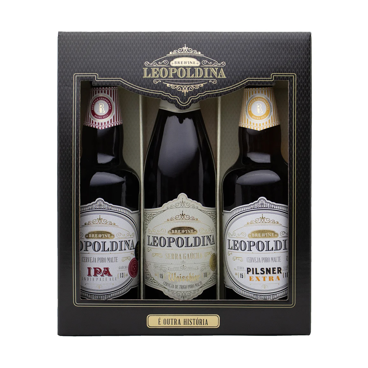 Kit em embalagem especial contendo três cervejas: Pilsner Extra, Weissbier e IPA, todas de 500 ml.