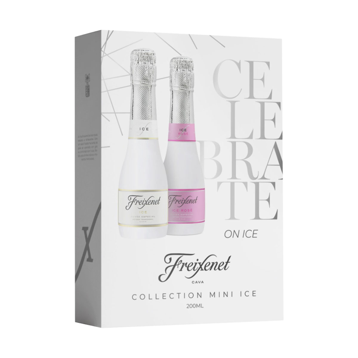 Kit composto por 1 Cava Freixenet Ice Demi-Sec 200ml e 1 Cava Freixenet Ice Rose Demi-Sec 200ml mais uma embalagem exclusiva.