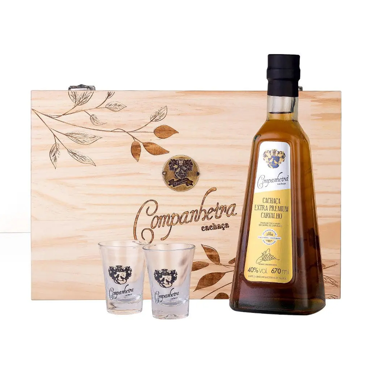 O Kit Madeira Cachaça Companheira Extra Premium 4 Anos 670 ml + 2 Copos é um presente sofisticado que reúne elegância e tradição. Produzido pela tradicional marca Companheira, esta cachaça extra premium repousou por 4 anos em barris de carvalho, adquirindo personalidade e suavidade únicas. Acompanha dois copos exclusivos e está apresentada em uma caixa de madeira personalizada, pronta para ser exibida ou presenteada.