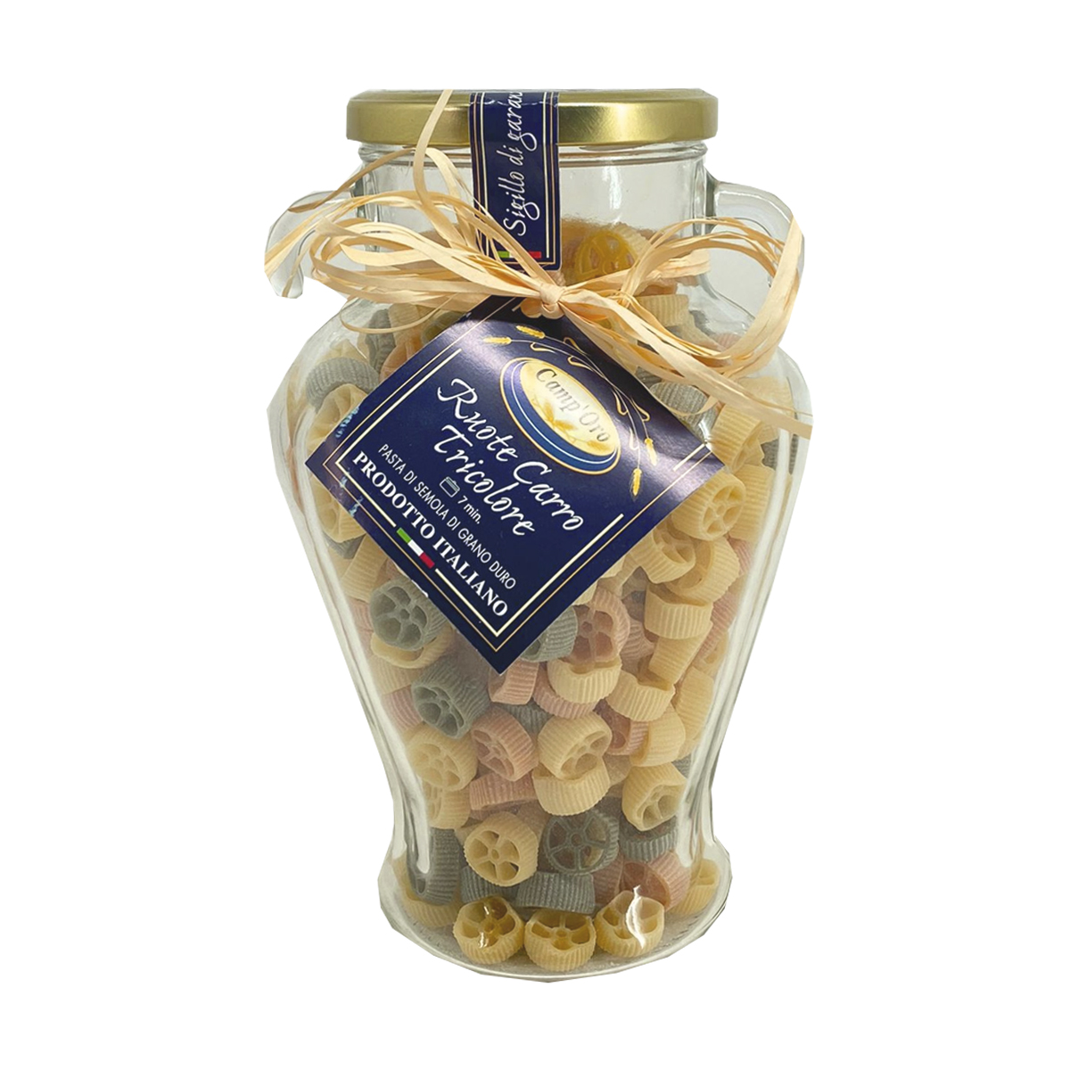 A Massa Ruote Carro Tricolore em Vaso Camp'Oro 500g é uma massa artesanal de alta qualidade, produzida com ingredientes selecionados e inspirada nas cores tradicionais da culinária italiana. Seu formato divertido e tricolor adiciona charme e sofisticação aos pratos, tornando qualquer refeição mais atrativa e saborosa.