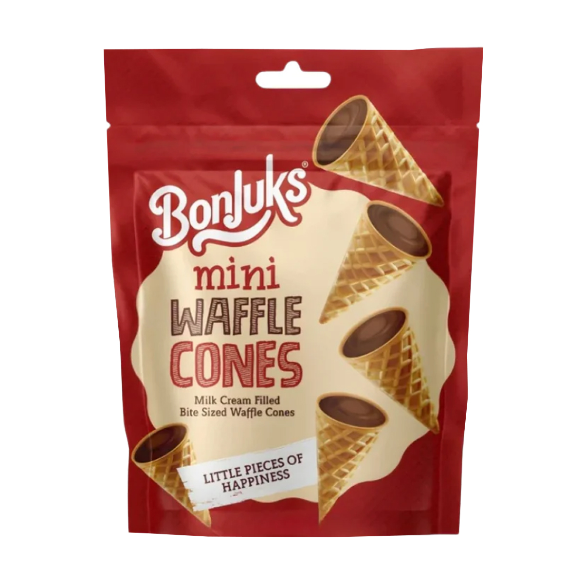 Os Mini Waffle Cones com Chocolate ao Leite Bonjuks 50g são irresistíveis mini cones crocantes de waffle combinados com delicioso chocolate ao leite, criando uma experiência doce equilibrada e cheia de textura. Leves, delicados e práticos, são perfeitos para quem busca um snack diferenciado, com crocância envolvente e sabor suave de chocolate.