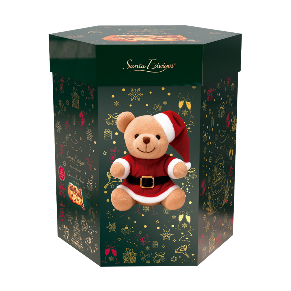 O Panettone Recheado de Creme de Avelã com Gotas de Chocolate com Pelúcia Santa Edwiges 1,1kg é a escolha perfeita para quem deseja presentear com charme, sabor e um toque especial de afeto. Elaborado com massa macia, aerada e extremamente saborosa, traz um recheio generoso de creme de avelã combinado com gotas de chocolate, proporcionando uma experiência rica, cremosa e irresistível.