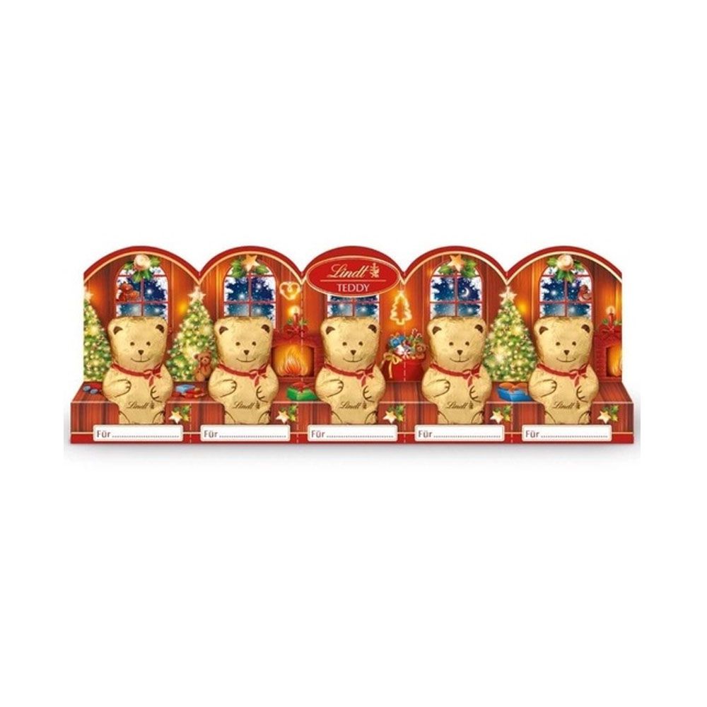 Cartela presenteável e destacável com 5 unidades de 10 gr cada do delicioso chocolate Lindt ao leite em formato de urso não maciço.